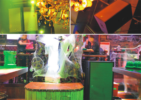 漫步入场,吧台顶壁上依旧挑着两颗骷髅假面,摇头灯射出的一束束幽冷的紫蓝光不时的扫向正中的僵尸残骸,黏在吊灯上的破纱布、杂乱无章的巨型蜘蛛网、阴森在角落里的巫婆鬼脸,仿佛依旧沉浸在24小时前的狂欢和劲舞的氤氲里。 环顾四周,无处不在的色彩元素,浓重的黑、褐、金和深棕色,鲜艳的陶红、庙黄色,珍珠色,奶白色将宗教的沉稳大气一览无余淋漓渲染。着一身的迷彩青绿的服务生与凌气盛妆的吧丽和Model们活泼的来往穿梭。 看似并不协调,恰似黑暗中独存的几缕顽劣的光明等待燎原的人潮人海…… 饮过几杯纯烈的Jacob Beam,在迷离中寻觅着“芒果”的优雅和风华。木花瓶的造型耐看而不张扬,独特的浮雕设计纹理诠释了更多的低调和细致的品位,镂空的装饰图案使整场的工艺装束愈加通透明朗。热烈、舒张、含蓄、妩媚,不得不赞叹这个“情调”高手的艺术才华,似乎在暗中宣战“绝不做攀援的凌霄花”!音响的分贝渐渐升高,LCD彩屏也随着灯光的节奏忽明忽暗,几个靓女跟随着DJ的情绪踏上表演舞台,音乐的声音时刻如簌簌疾风顷刻又混沌如雨。鲜艳的红唇、加勒比海盗船的骷髅旗帜、妖娆的酥胸翘臀和万圣节的狂欢记忆在LCD大屏中循环播放……