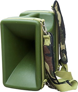 》喊话器背部配有防雨罩,能更好的保护数字功放;箱体上部把手式设计,并配有背带,方便携带。